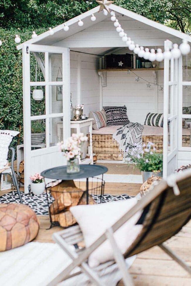 Small garden sheds can quickly become charming personal spaces with strategic design elements like comfortable daybeds and carefully selected textiles.