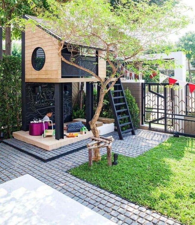 Strategic design maximizes backyard potential by providing a dedicated play area that looks stylish and serves multiple purposes.