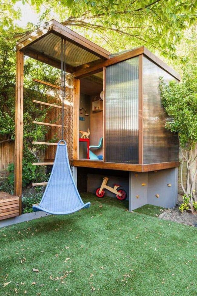 Kids love backyard retreats that spark imagination and adventure, and this raised playhouse design delivers excitement with its modern wooden frame and transparent corrugated plastic sides.