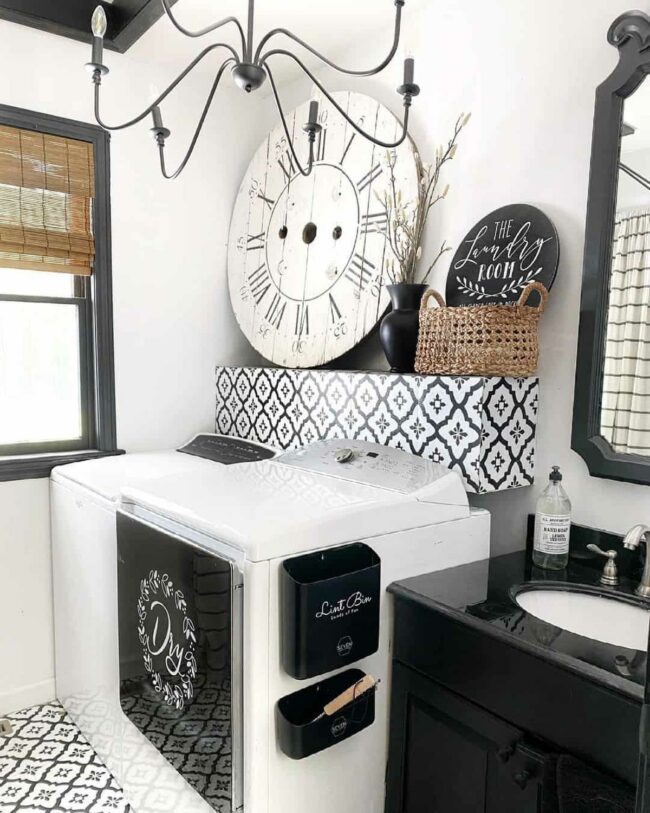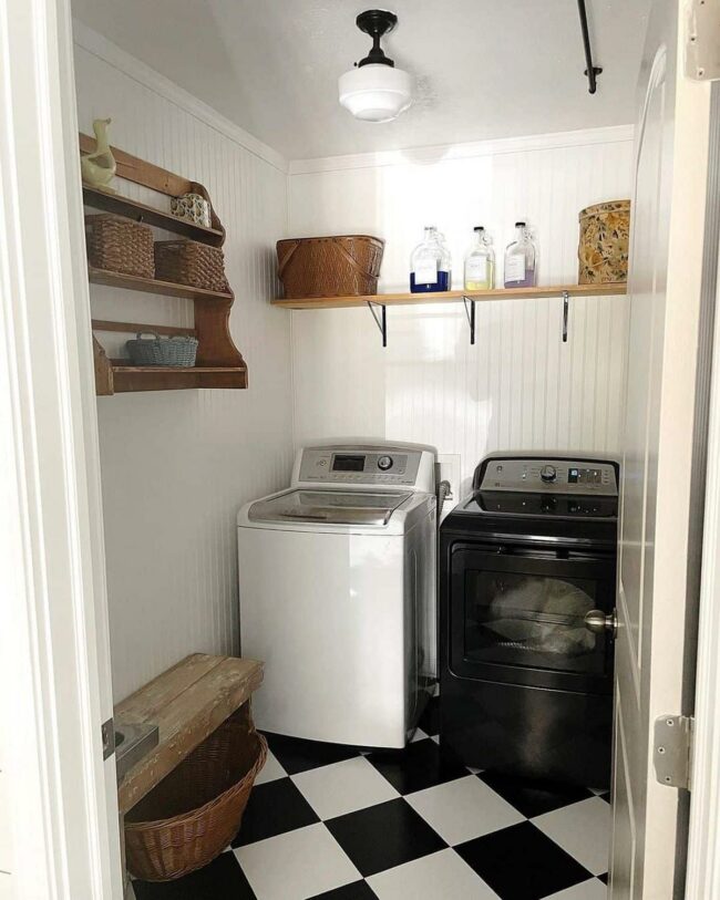 Striking black and white checkered floors instantly elevate laundry chores from mundane to exciting.
