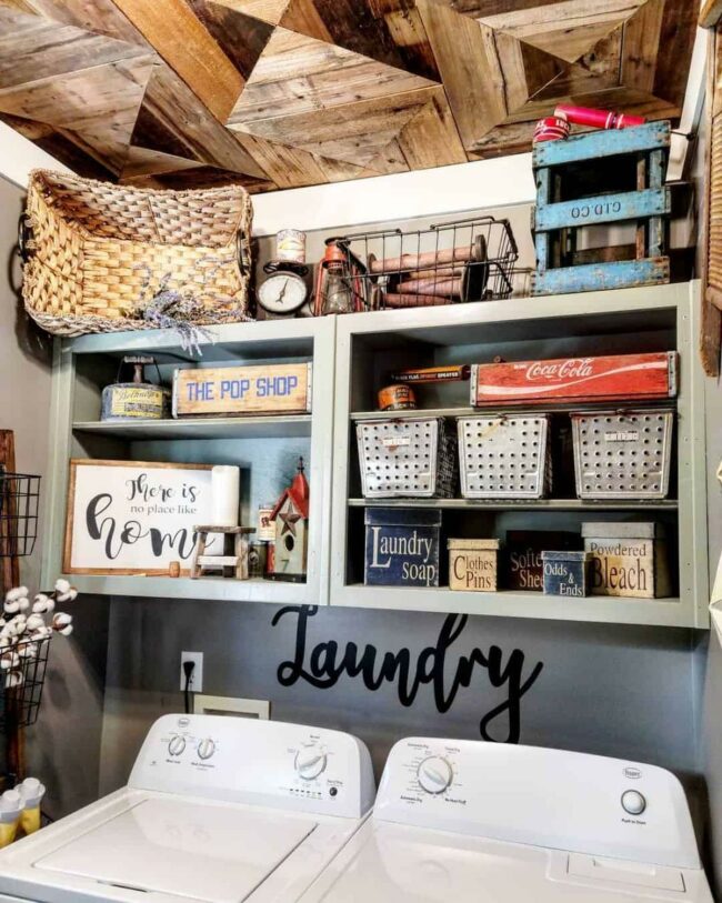 Wood ceiling ornaments elevate this laundry space with unexpected elegance, making mundane tasks feel special.