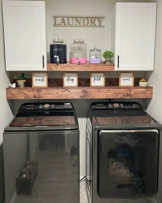 Wooden cabinets mounted above washers and dryers maximize storage potential, keeping detergents and supplies neatly tucked away.