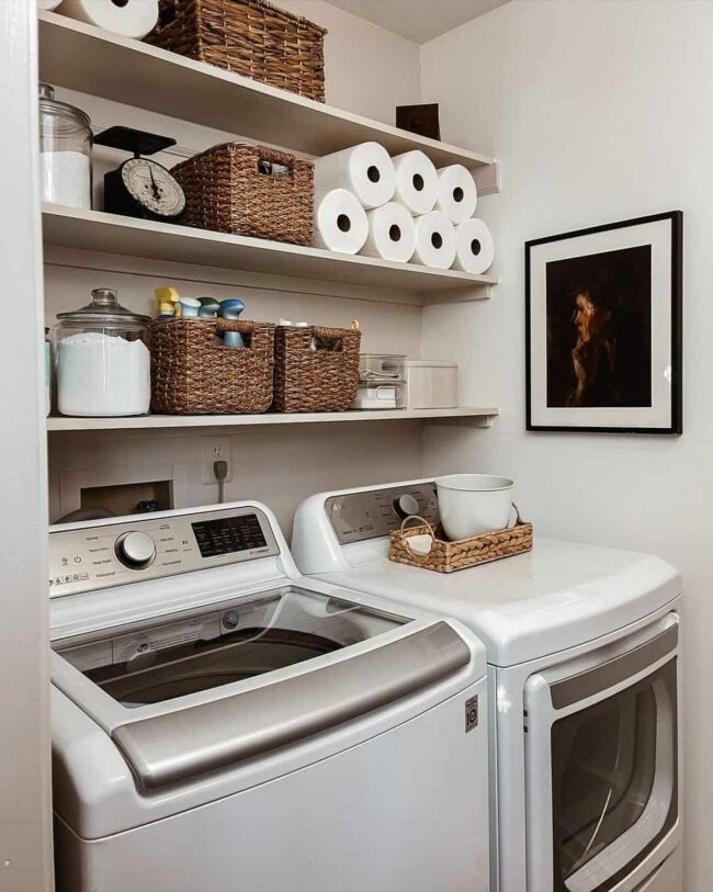 White washers and dryers create a crisp, clean backdrop for smart organization.