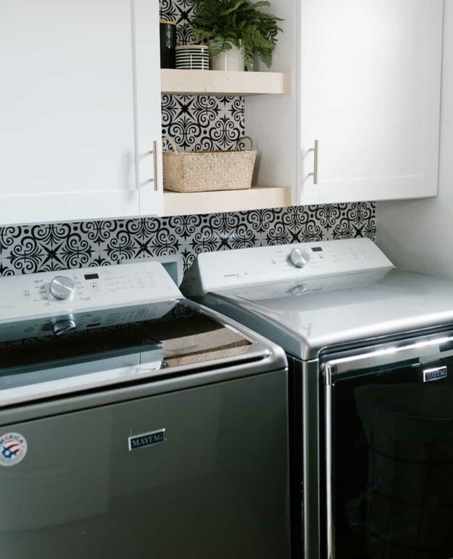 Black-and-white tile backsplash dominates this laundry room, immediately drawing attention with its graphic pattern.