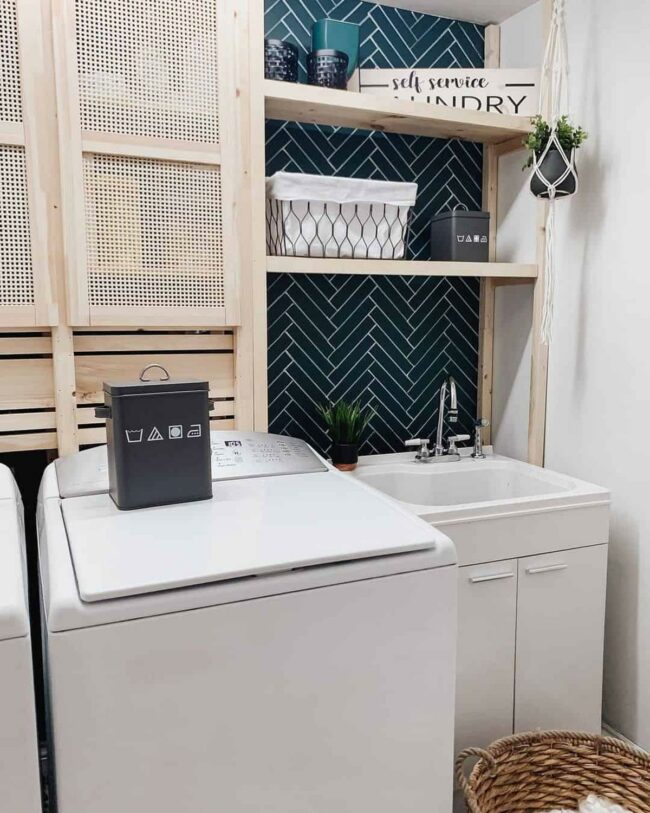Herringbone tile walls instantly elevate a laundry room's aesthetic, creating a stunning backdrop that draws attention.