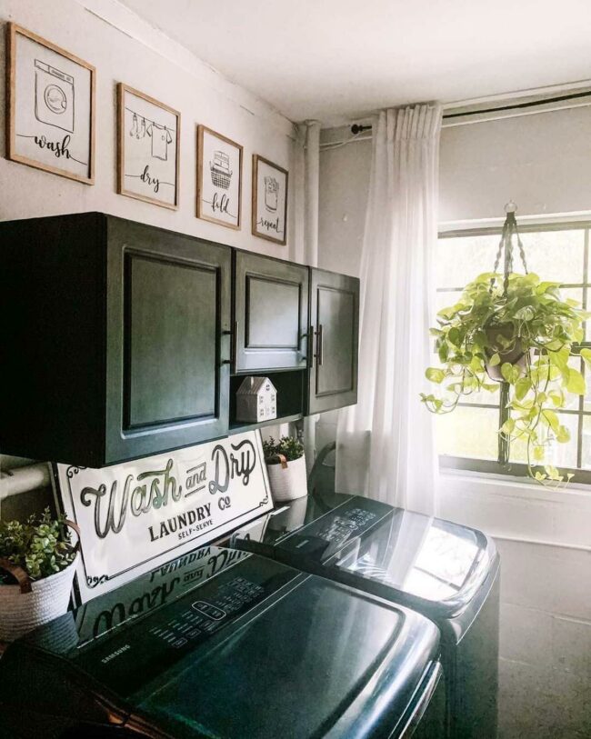 Black cabinets make this tiny laundry room pop with unexpected elegance, maximizing storage while looking seriously chic.