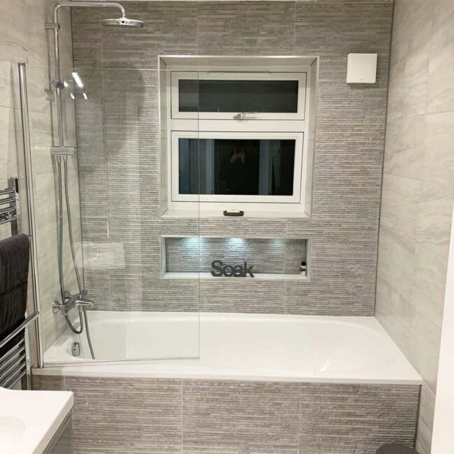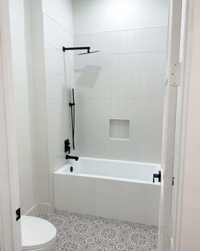 Smart design details like a small niche above the bathtub offer clever storage solutions without sacrificing style.