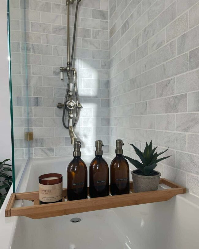 A wooden bath caddy introduces warmth and functionality, serving as a perfect spot for displaying decorative elements.