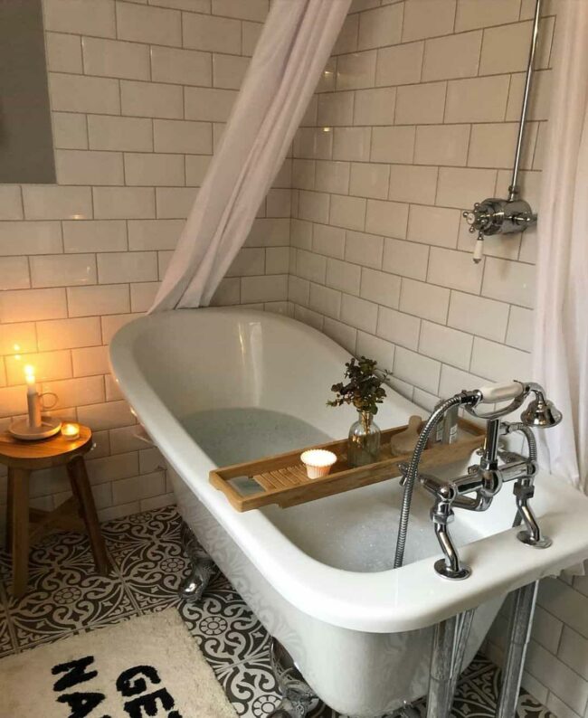 Curves of the vintage bathtub blend seamlessly with the artistic tile arrangement.