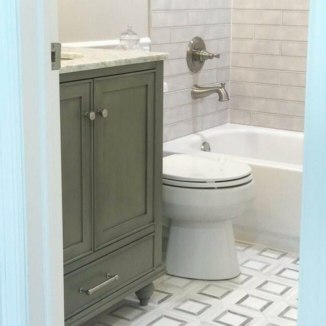Pairing a painted wooden vanity with gray and white tiled flooring introduces a striking visual contrast that adds remarkable depth.