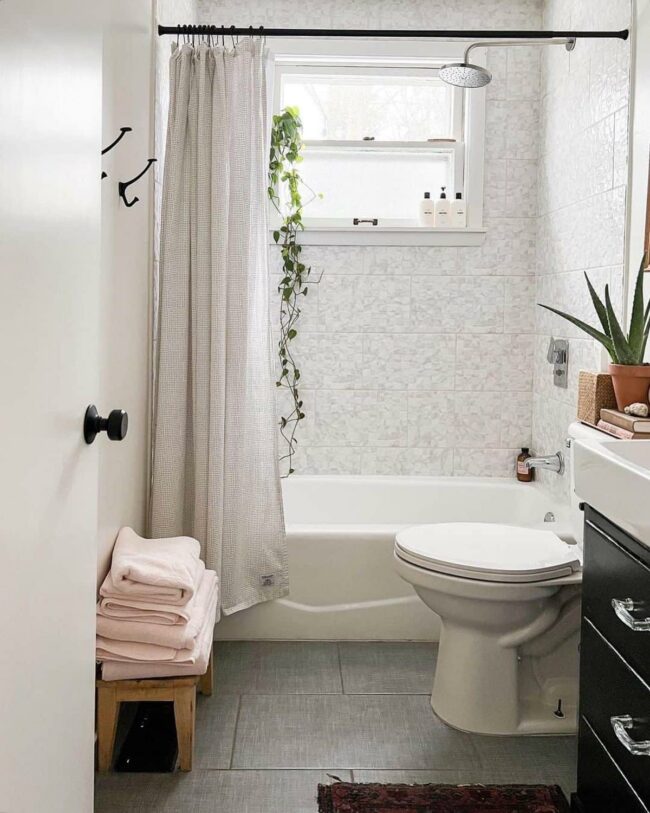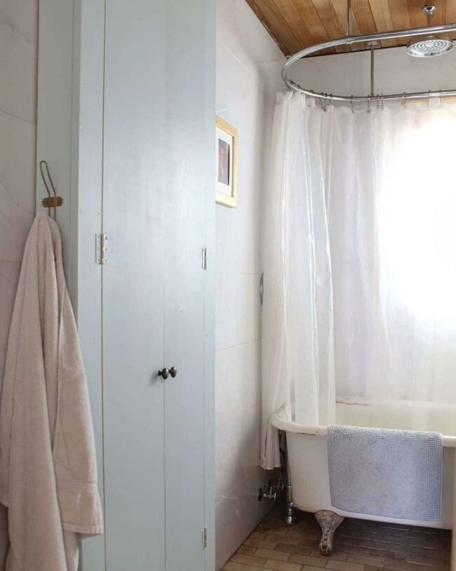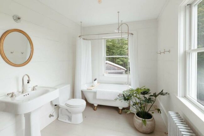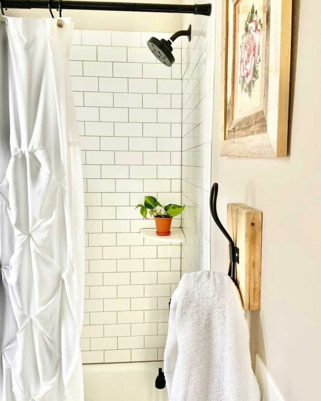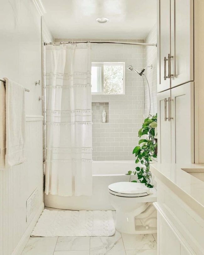 White shower curtains frame the space with classic charm, offering both privacy and style.