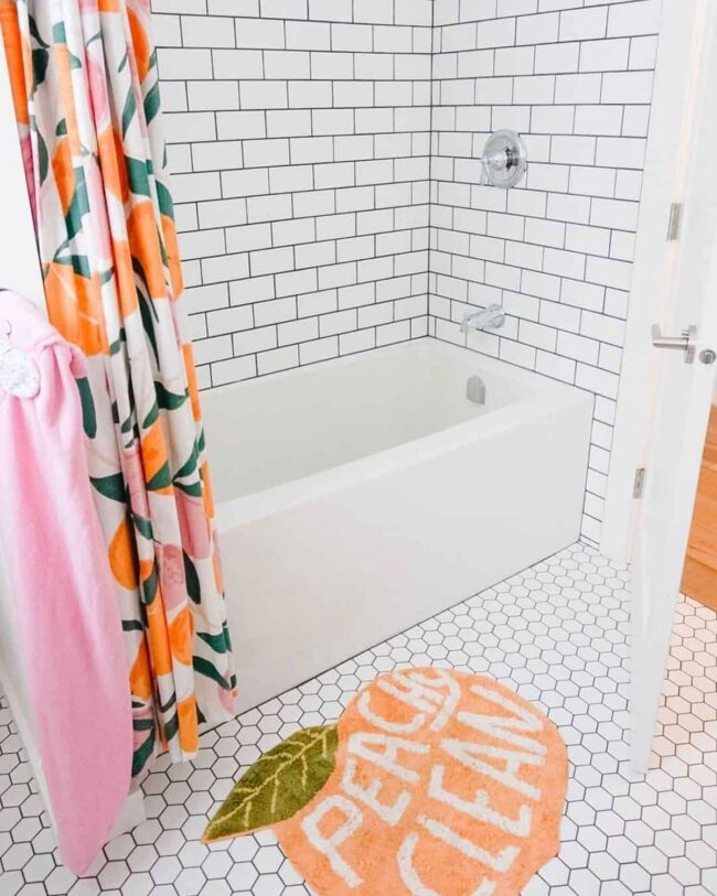 White bathrooms come alive with colorful accents that spark joy and personality.