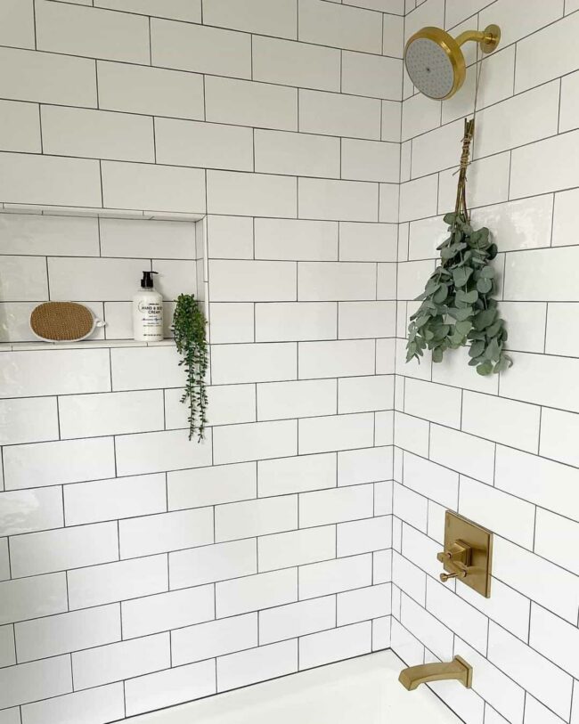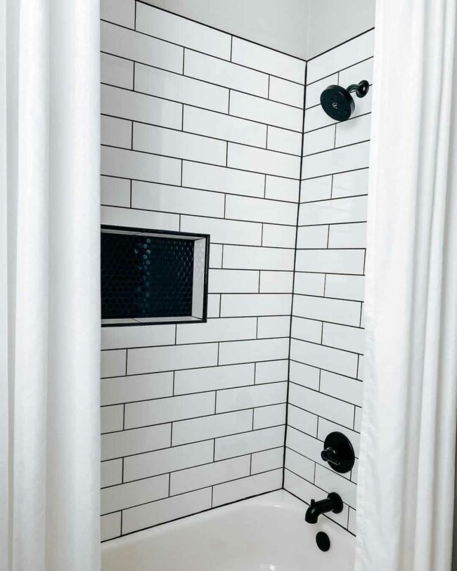 Dramatic black grout against classic white subway tiles creates incredible depth and visual interest throughout the space.