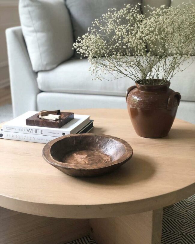 Decorative elements like magazines, clay bowls, and carved wood trays create visual interest around the centerpiece.