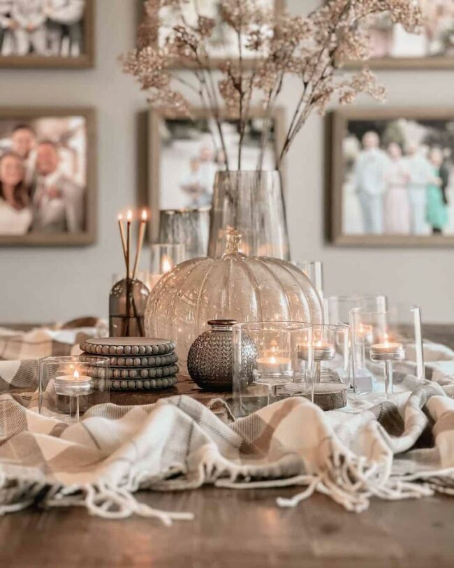 Natural materials and carefully curated accessories transform the dining area into a welcoming autumn sanctuary.