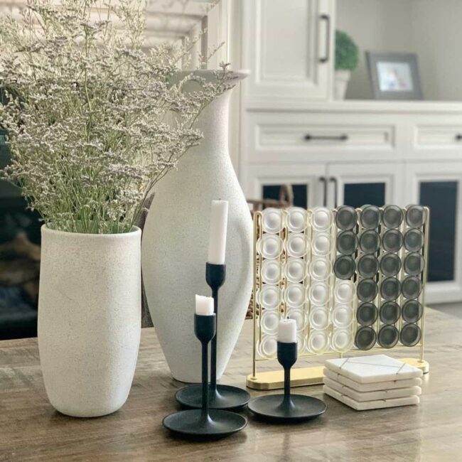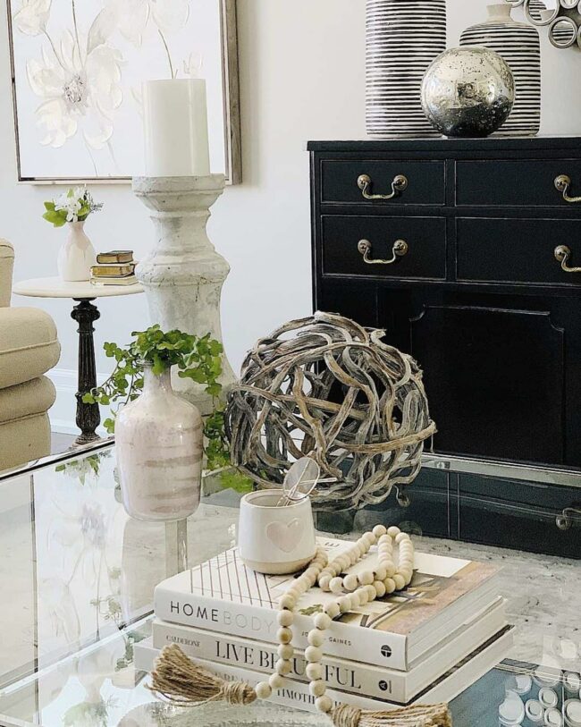 Candle stands and vases alongside a rustic twig ball create visual poetry on your coffee table.