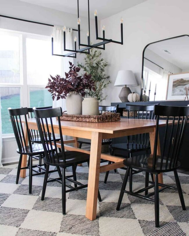 Cream pumpkins subtly echo the vase colors, while black dining chairs connect visually with the mirror's bold frame.