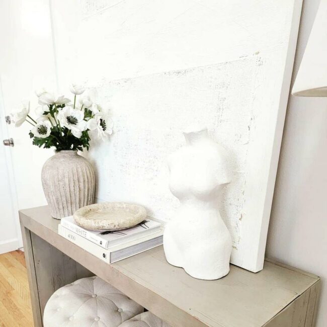 Complementing the organic feel, an off-white clay bowl filled with delicate beads adds artistic texture and visual interest.
