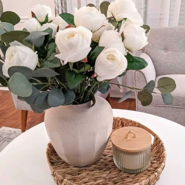 White faux flowers in a delicate vase add soft organic elements to the scene.