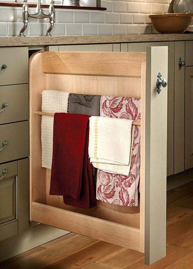 Metal or wooden dowels can be easily installed inside vanity cabinets, creating a smart solution for keeping towels neatly arranged and instantly accessible.