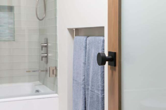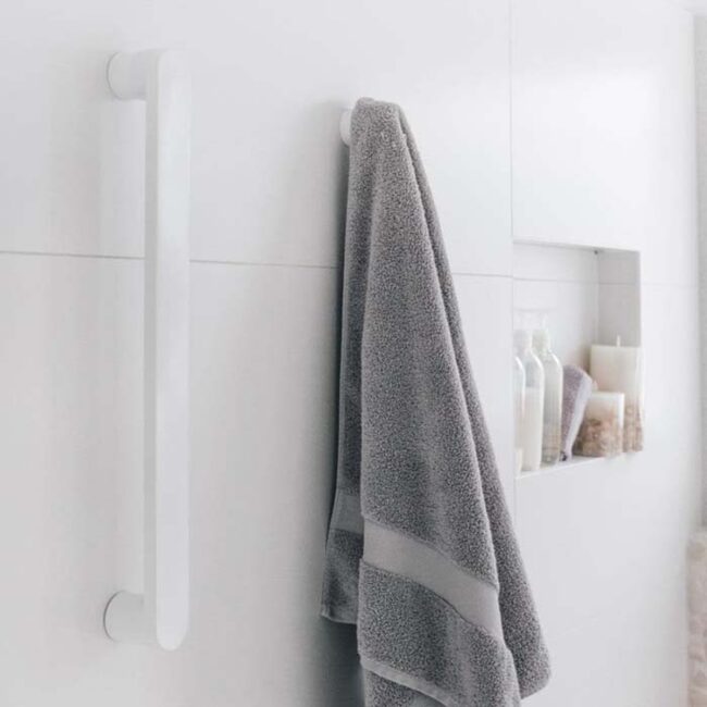 Minimalist in approach, alcove racks blend effortlessly with existing bathroom decor.