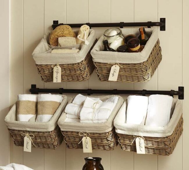 Strategic basket placement creates a stylish display that keeps toiletries, towels, and personal items neatly arranged and easily accessible.