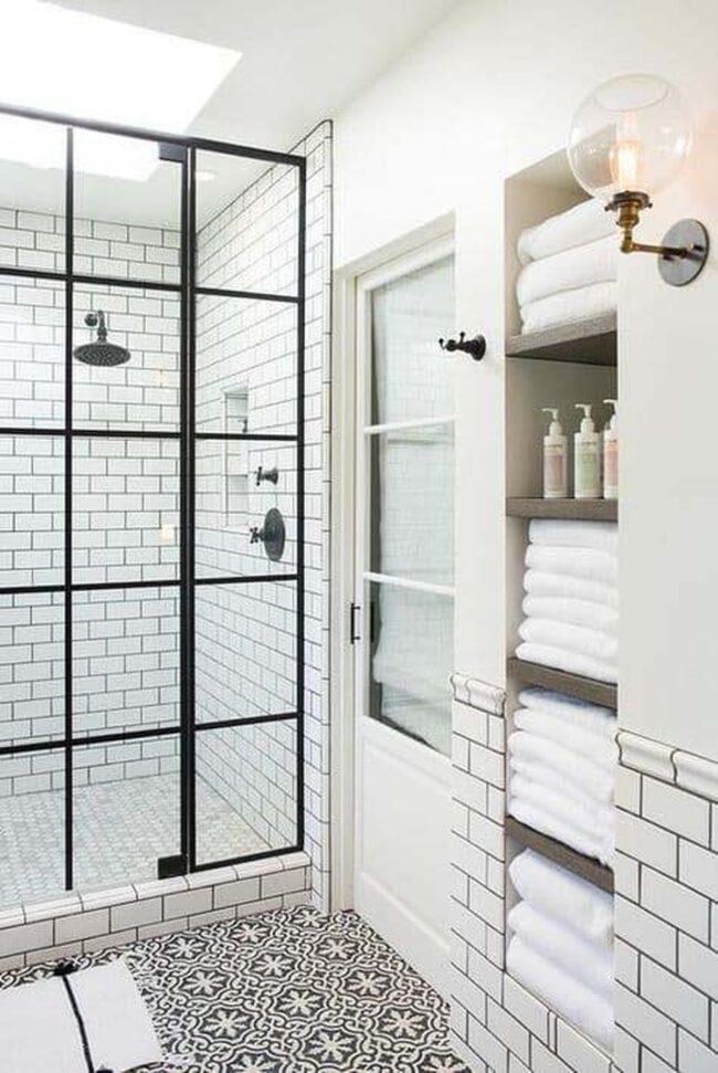 Installing these built-in shelves eliminates floor clutter and creates a streamlined look that enhances bathroom design.