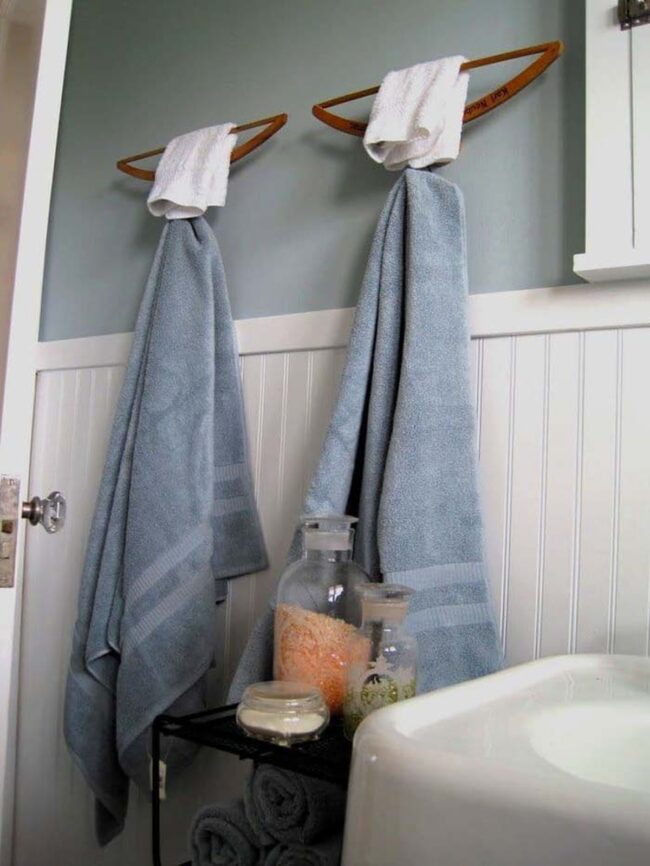 Two or three standard hangers, strategically positioned and flipped upside down, create a charming display that holds multiple towels without cluttering precious bathroom real estate.