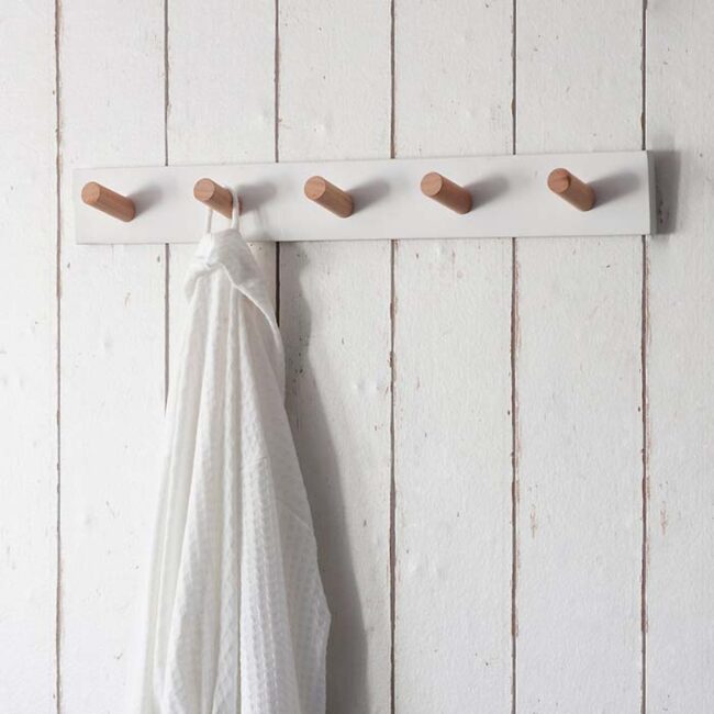 Five carefully spaced wooden pegs provide ample hanging spots for bath towels, hand towels, and washcloths without cluttering counters or towel bars.