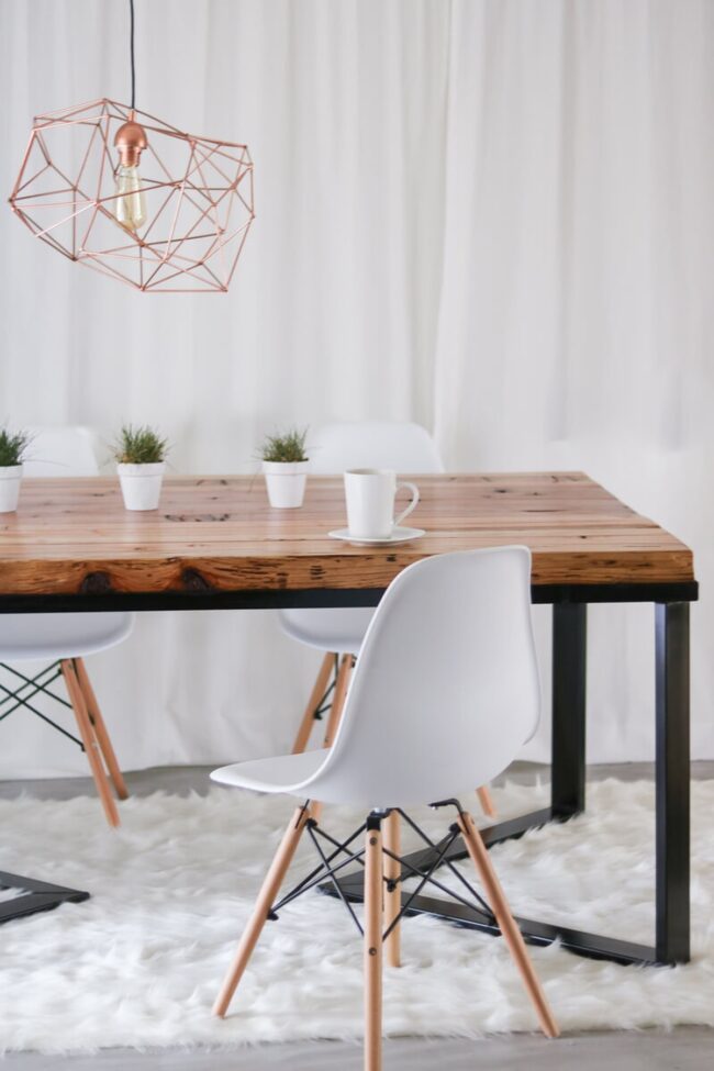 Weathered wood and sleek black metal legs combine to create an extraordinary kitchen table that screams rustic charm.