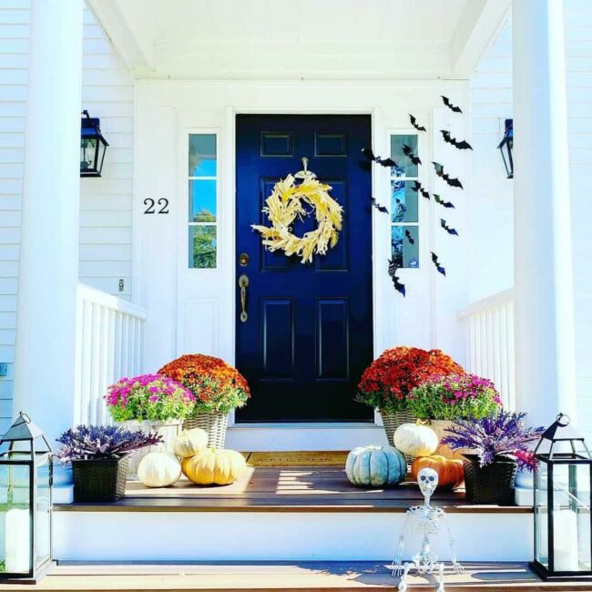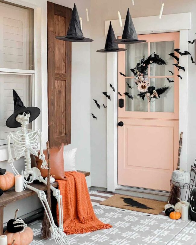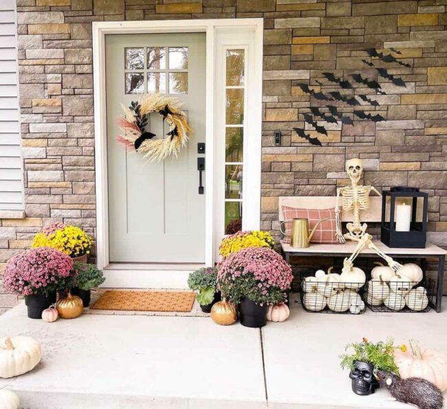 Whimsical Halloween decorations capture immediate attention, showcasing a wreath adorned with playful bats and a skeleton.