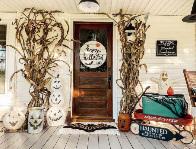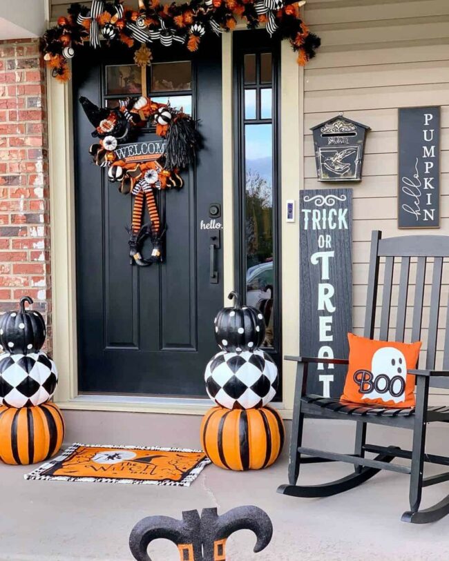 Porch decor becomes a playful invitation to embrace autumn's most thrilling celebration.