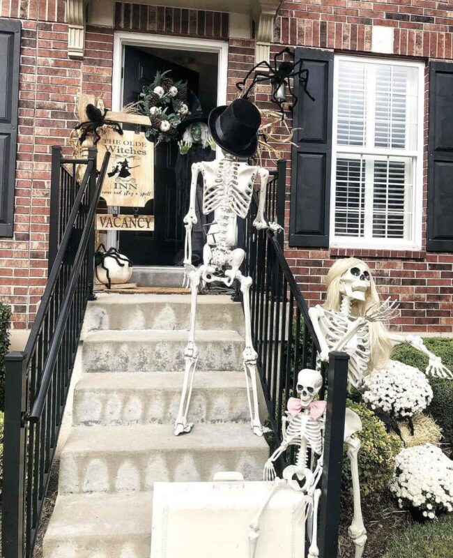 Skeleton decorations transform this brick home's porch into a playful Halloween haven that stops people in their tracks.