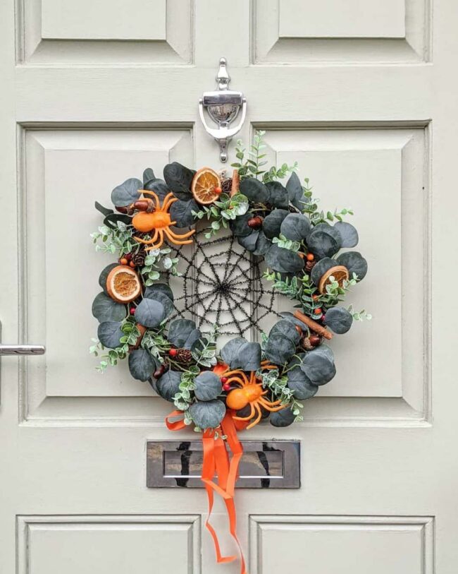 Hanging nearby, a whimsical Halloween wreath sprinkled with ornamental details immediately signals welcoming energy to anyone approaching.