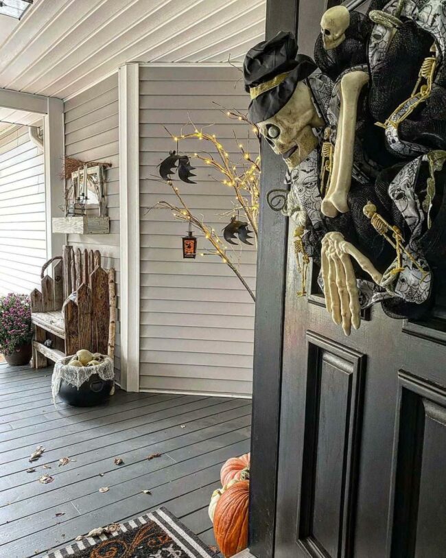 Unexpected details like a skeleton wreath hanging on the door add a playful twist that makes visitors both smile and shiver.