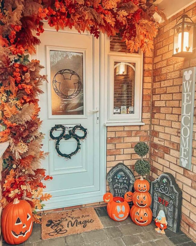 Charming Disney-inspired pumpkins nestle beside the entrance, adding a touch of whimsy to the rustic scene.