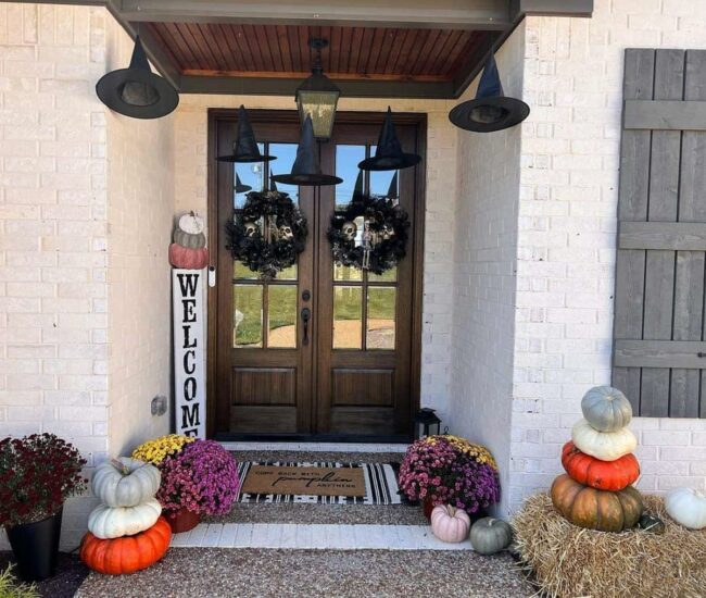 Patterned pumpkins scatter playful autumn vibes across the entrance, creating an instant mood of festive celebration.