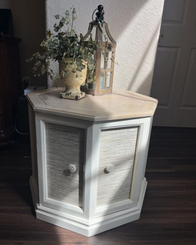 Dark wood morphed into a coastal-inspired masterpiece through strategic painting and gentle sanding, revealing an octagonal end table with elegant potential.