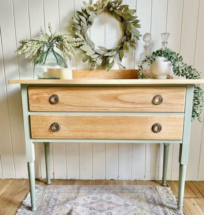 Gentle sage green provides a calming backdrop that softens the rich wood grain, inviting peaceful vibes into any room.