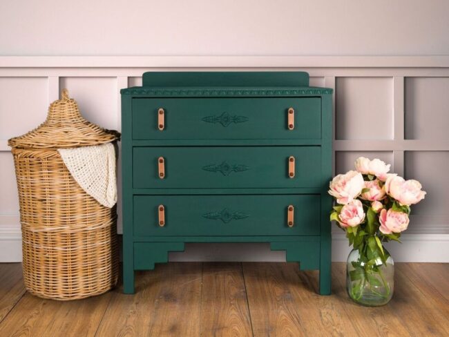 Midnight green exterior paint breathes new energy into the piece, creating a bold statement in any room.