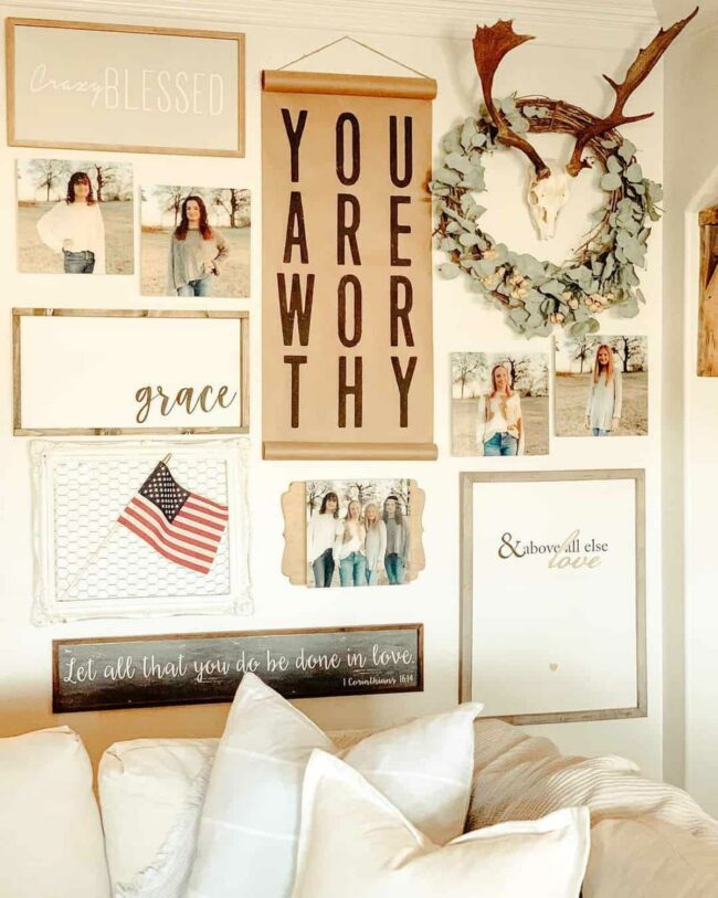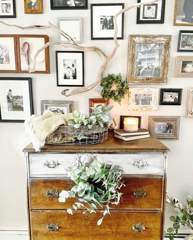 Family photos dance across the wall in mismatched frames, telling stories of love and memories through rustic wood and classic black designs.