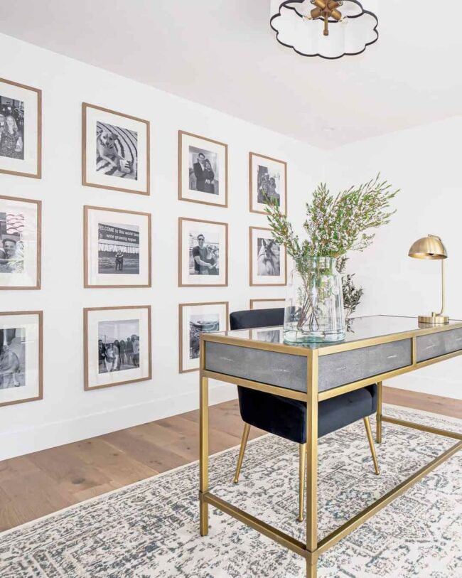 Family memories burst from twelve black and white photographs mounted in gleaming brass frames, commanding attention across the back wall of this modern home office.
