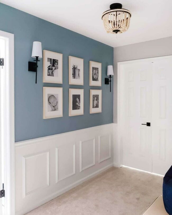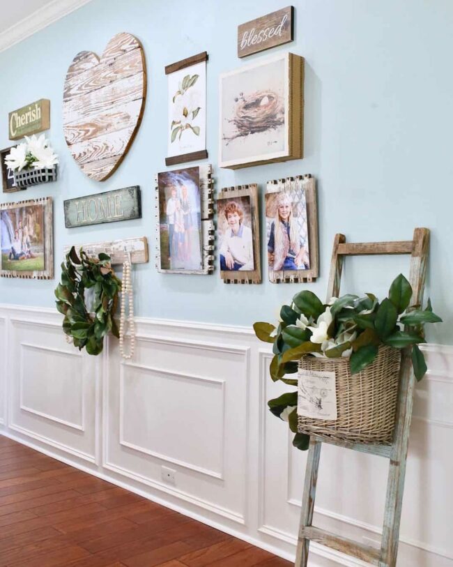Blue walls paired with white wainscoting create a dreamy backdrop for a personalized gallery wall bursting with character.