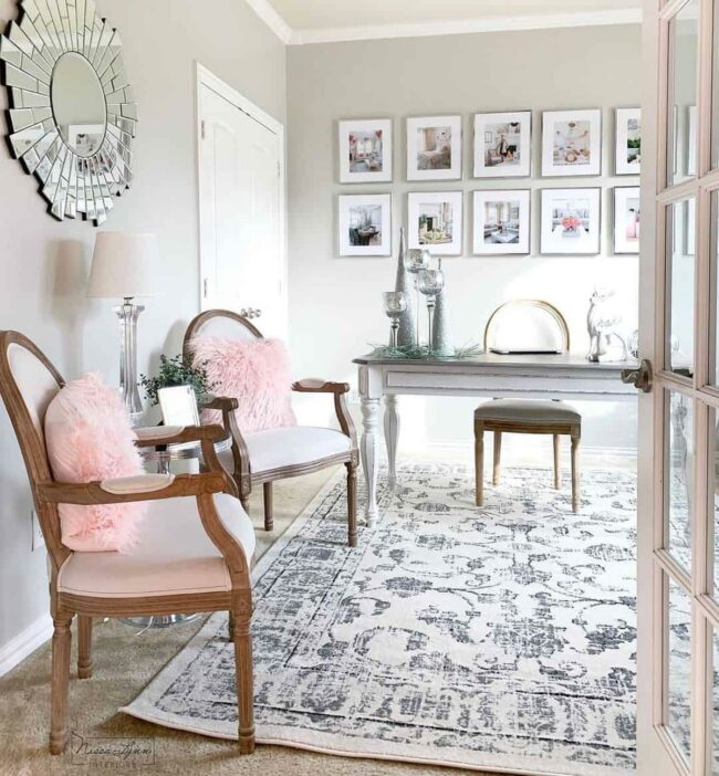 Vintage photo collections blend seamlessly with minimalist desk and chair selections.