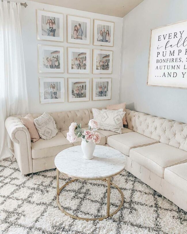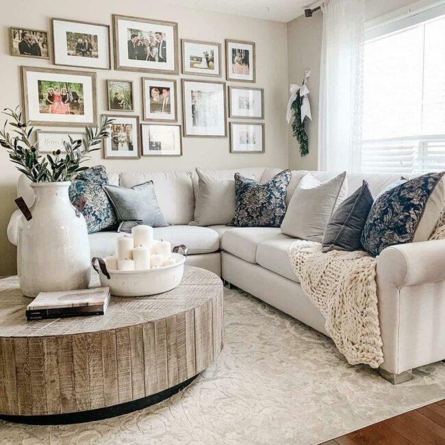 Sunlight streams through windows, illuminating a welcoming living room centered around an elegant L-shaped couch nestled beneath a carefully curated gallery wall.