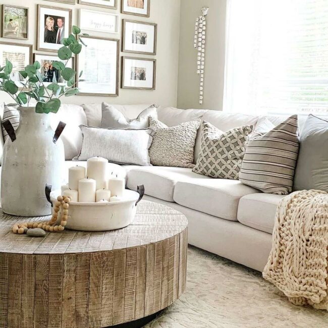 Light beige couches anchor the space, softened by textured gray throw pillows that invite relaxation.