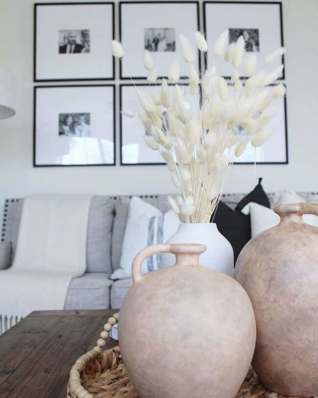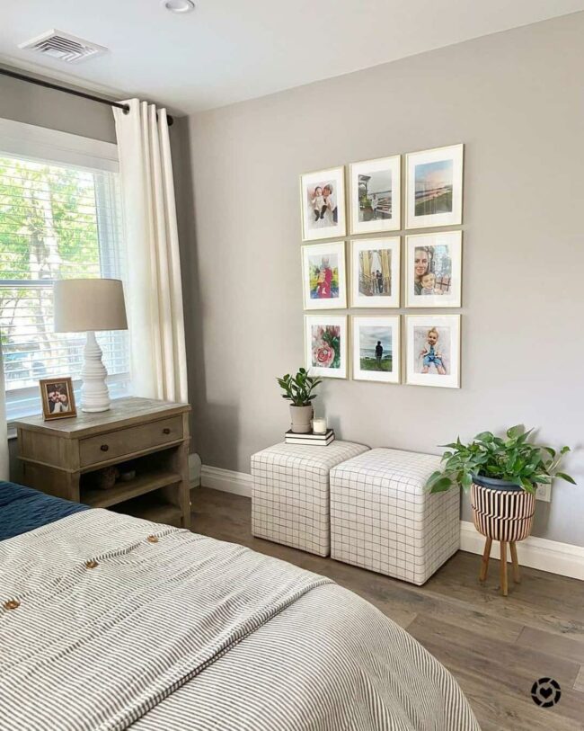 Wooden photo frames showcase memories while adding warmth to the neutral color palette.