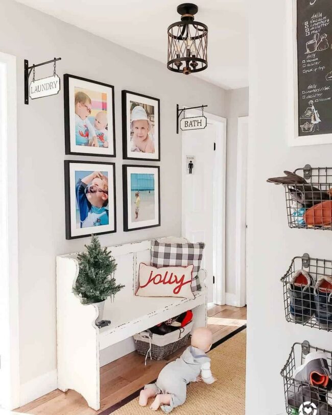 Vertical photo arrangements draw the eye upward, making the entryway feel more spacious and dynamic.