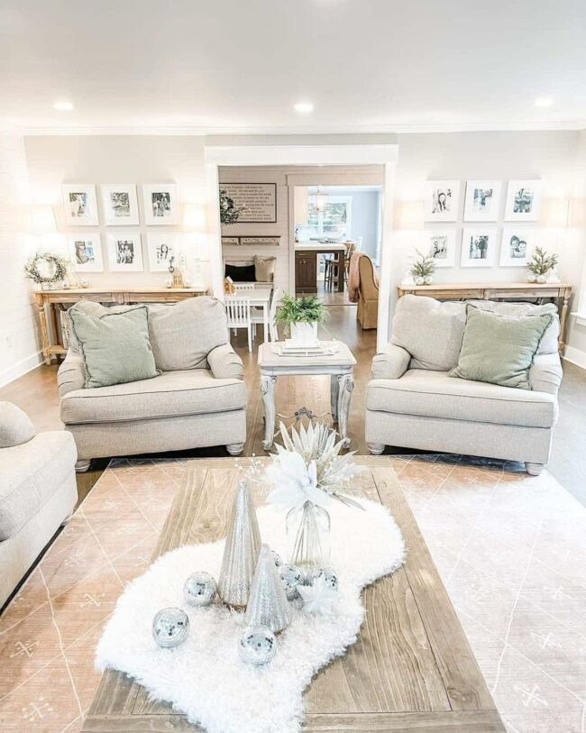 White rectangular frames symmetrically line the living room entrance, guiding eyes toward the central seating area.