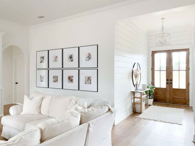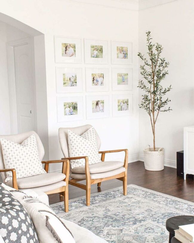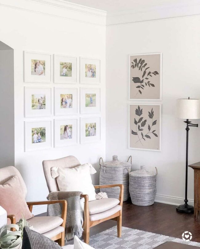 Family memories capture attention in this white-walled living room through nine carefully arranged color photographs.
